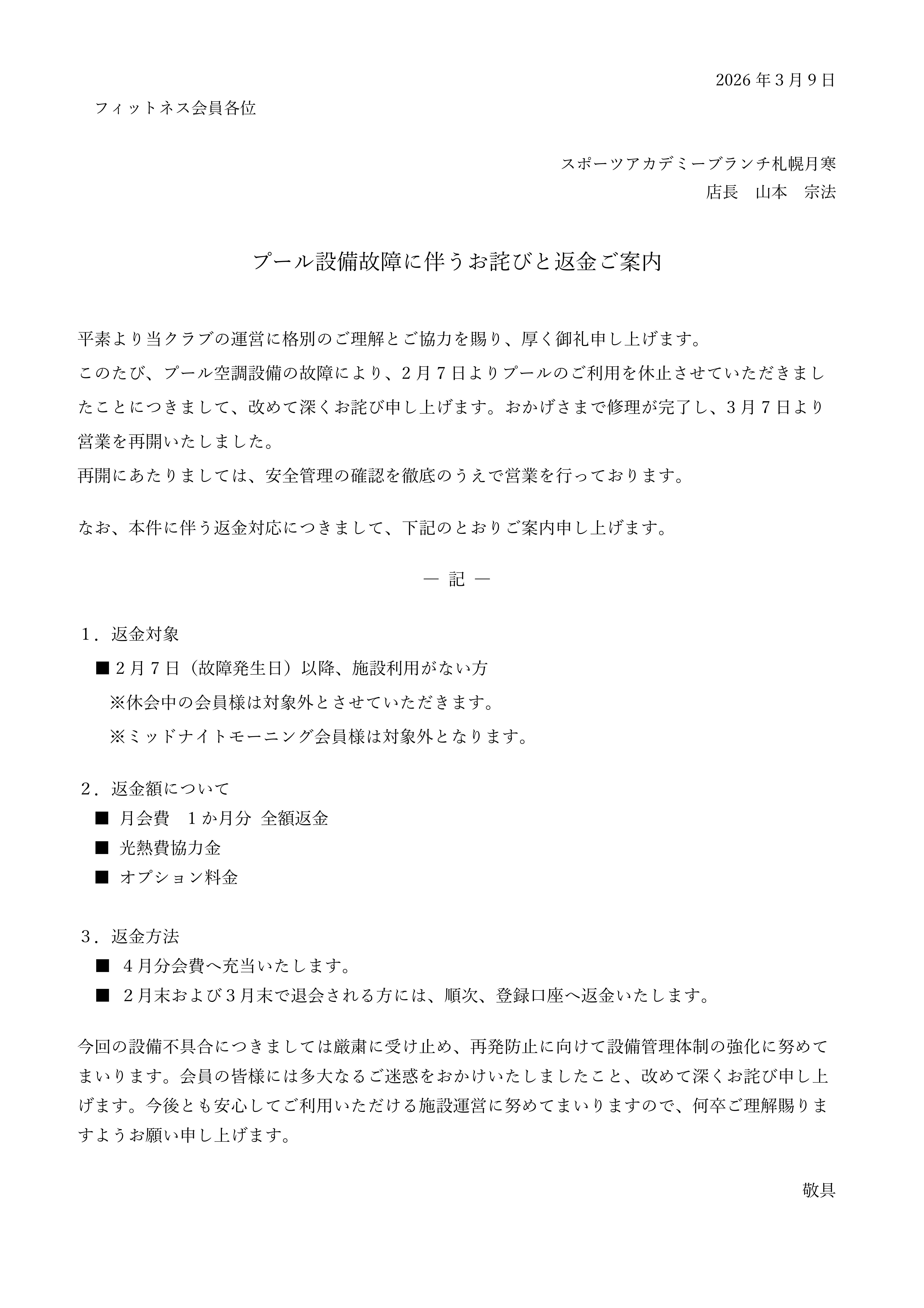 - 【重要】フィットネス会員様_プール設備故障に伴うお詫びと返金のご案内